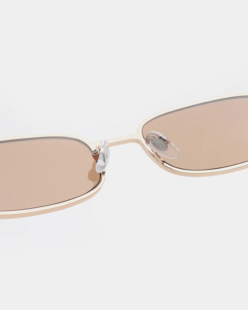 Noah – Gold Burnt Amber is een klassiek unisex ontwerp met een duidelijke knipoog naar de jaren 90 en een coole, minimalistische look. Het smalle metalen montuur en de kleine, vierkante glazen zorgen voor een lichte en elegante look die werkt voor zowel kleine als grote gezichten zonder te overheersen. Noah is voor diegenen die een stijlvolle zonnebril willen met een scherp silhouet en een duidelijker statement.