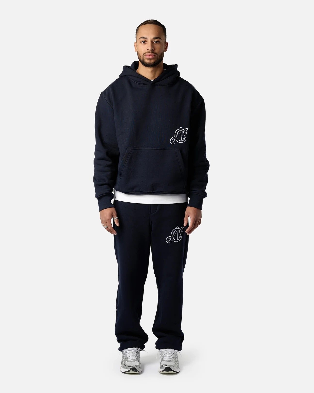 This navy hoodie is crafted from heavyweight 100% cotton (640 GSM). It features a relaxed fit with dropped shoulders.