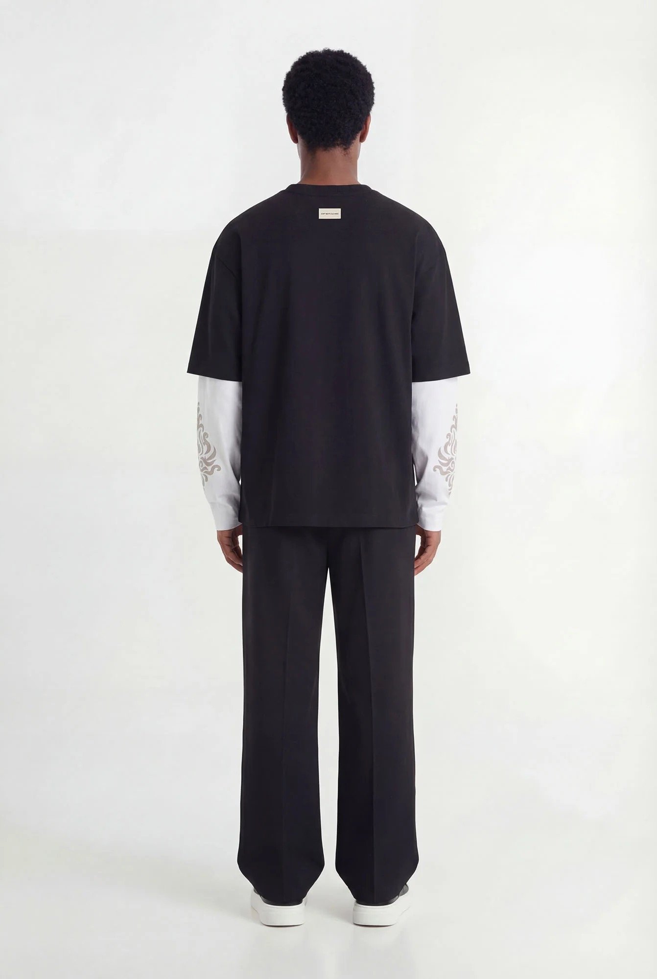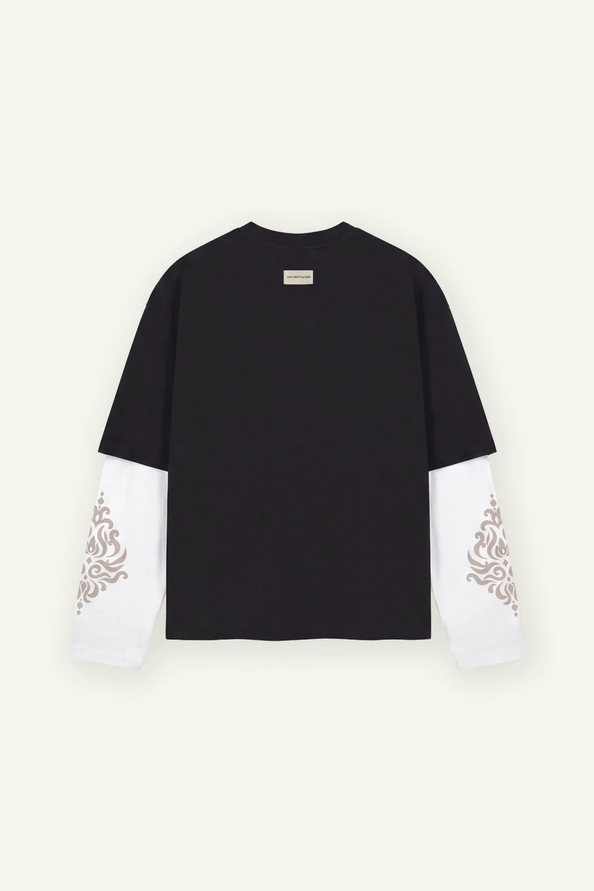 Made from pre-washed 230gsm cotton, the fabric feels soft while holding its shape. The oversized fit gives it a relaxed silhouette, while the attached layered construction adds depth without adding weight. Ornament prints run along the arms, with an additional print placed just below the chest, creating a balanced composition across the garment.