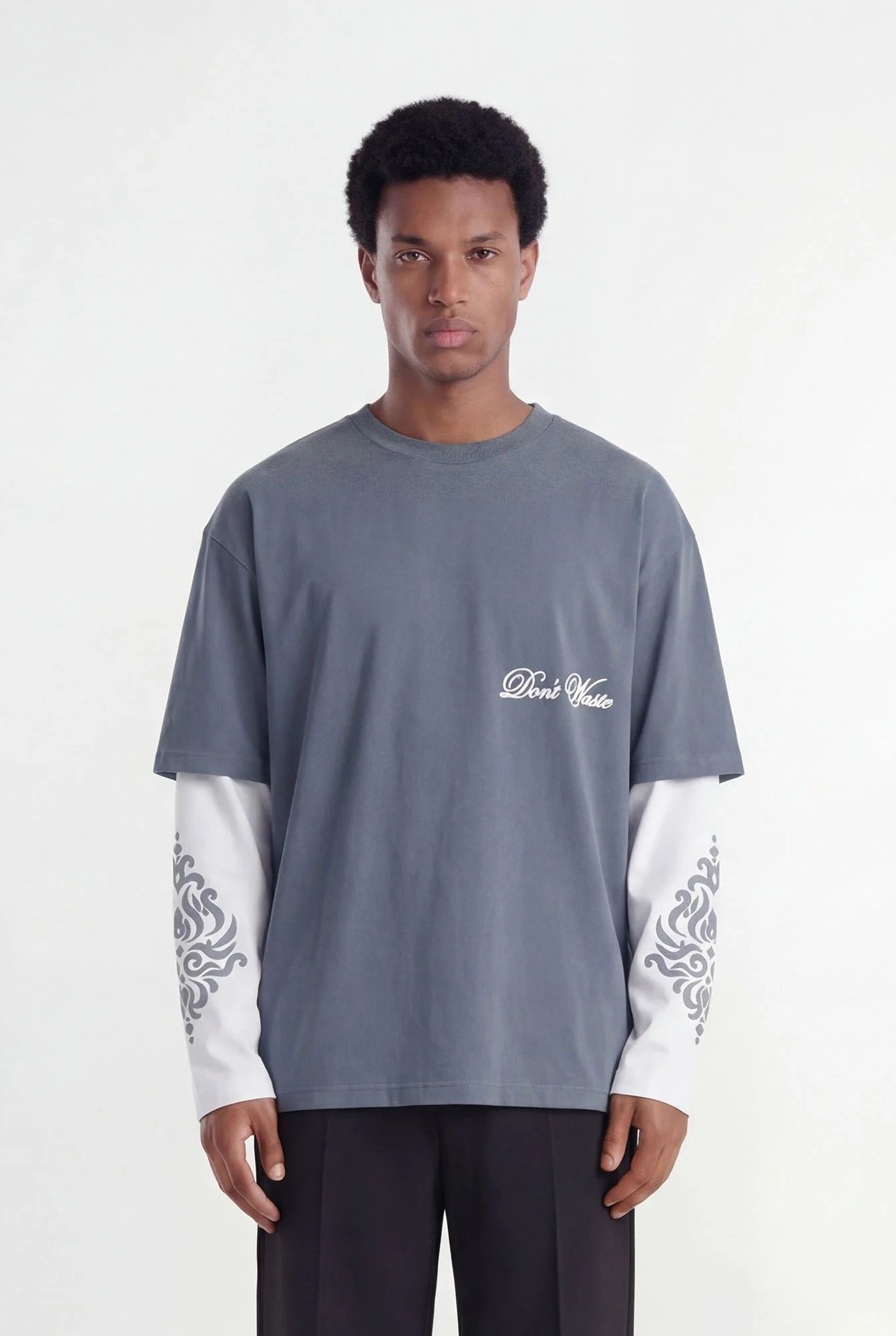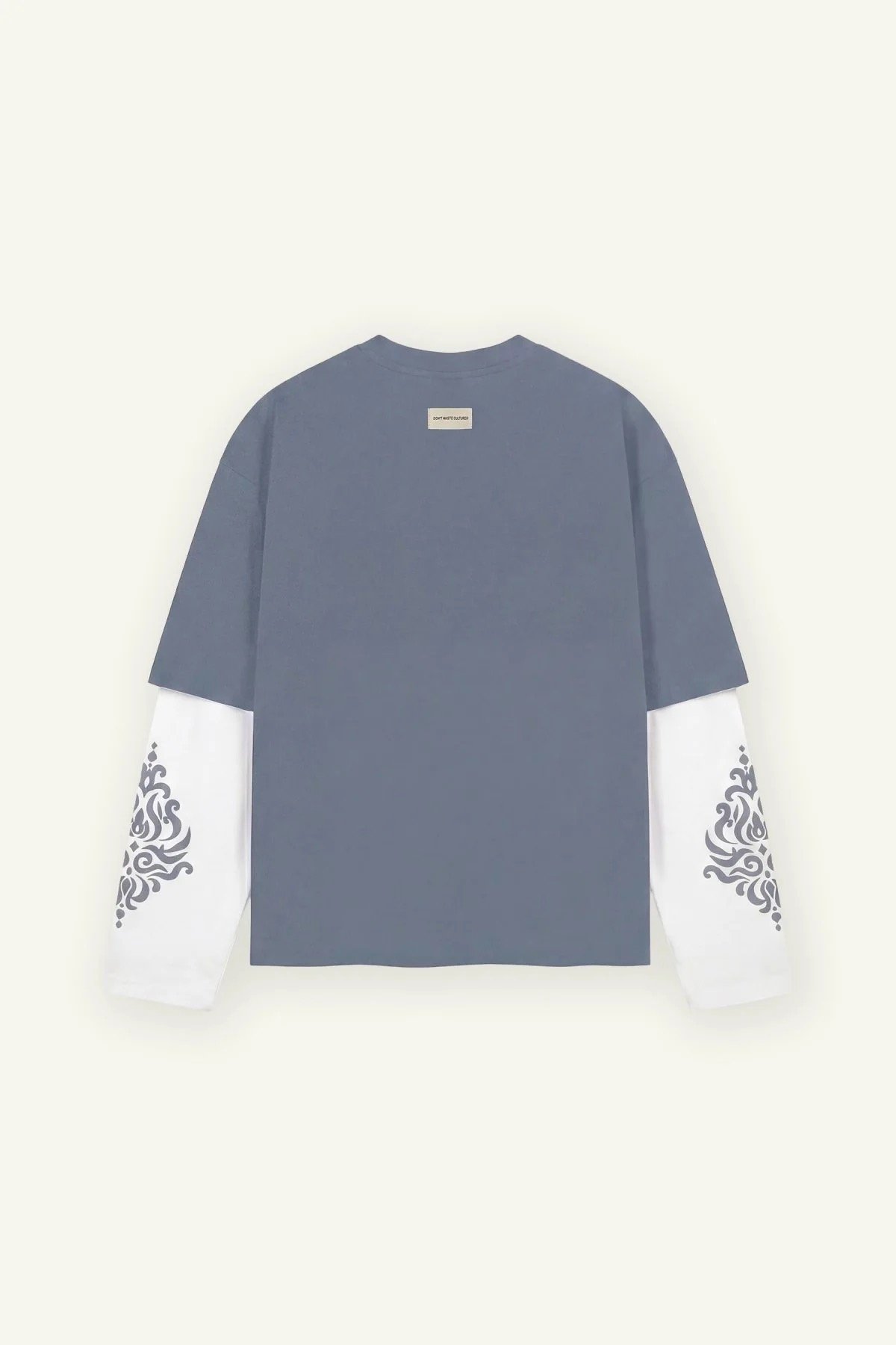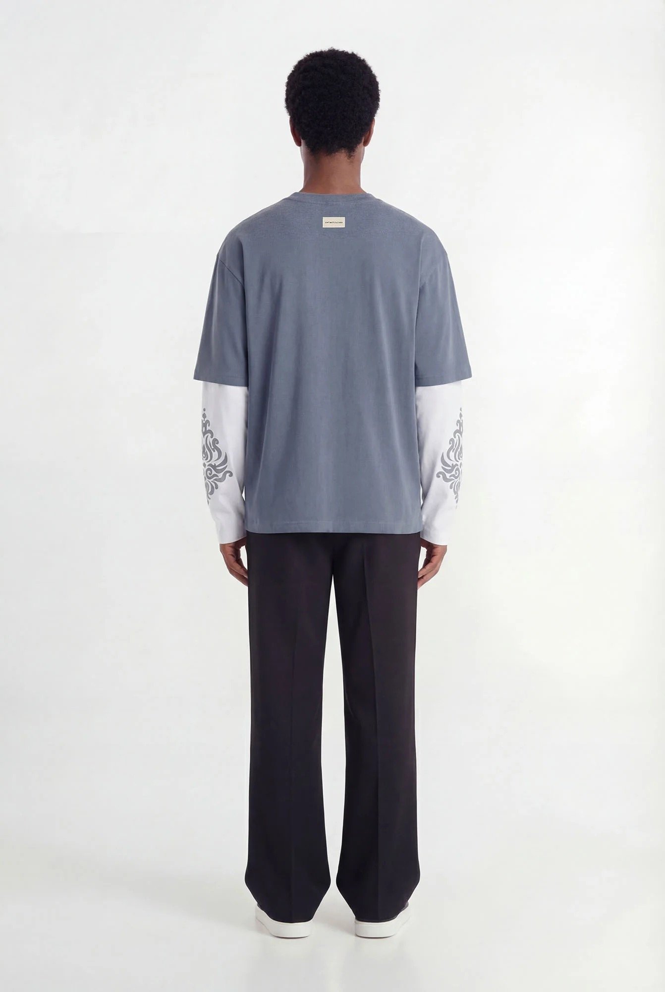 Made from pre-washed 230gsm cotton, the fabric feels soft while holding its shape. The oversized fit gives it a relaxed silhouette, while the attached layered construction adds depth without adding weight. Ornament prints run along the arms, with an additional print placed just below the chest, creating a balanced composition across the garment.
