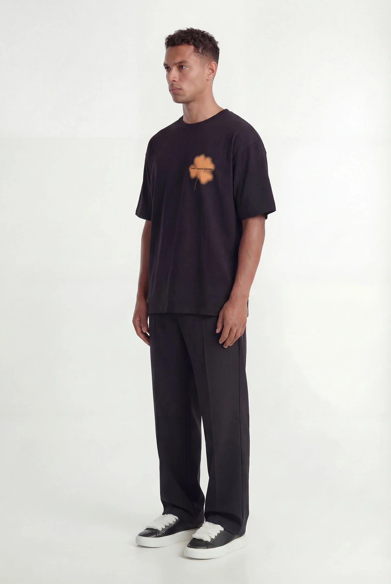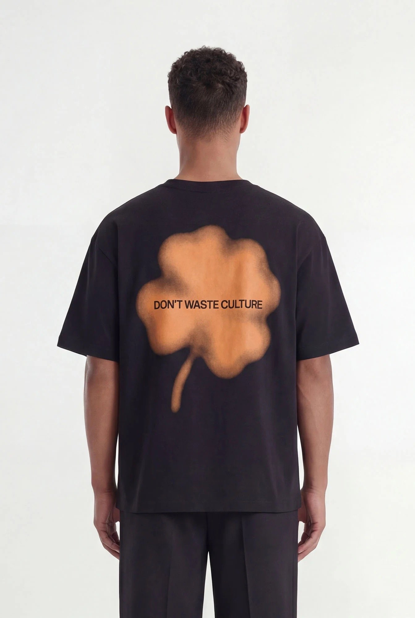 Crafted from substantial 250gsm cotton, the fabric feels structured yet comfortable, maintaining its shape throughout the day. The clover screenprint appears on both the front and back in a soft faded execution, giving the graphic a worn, integrated character rather than a bold statement.