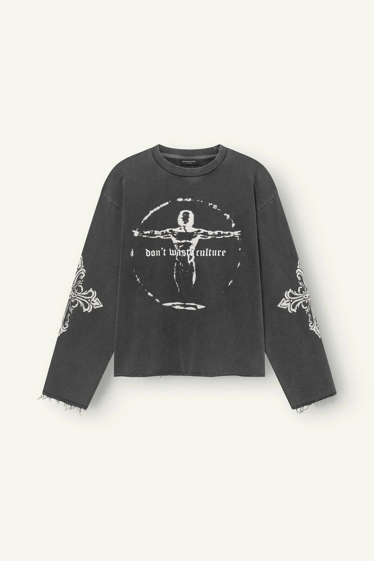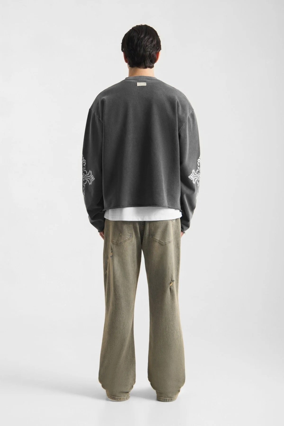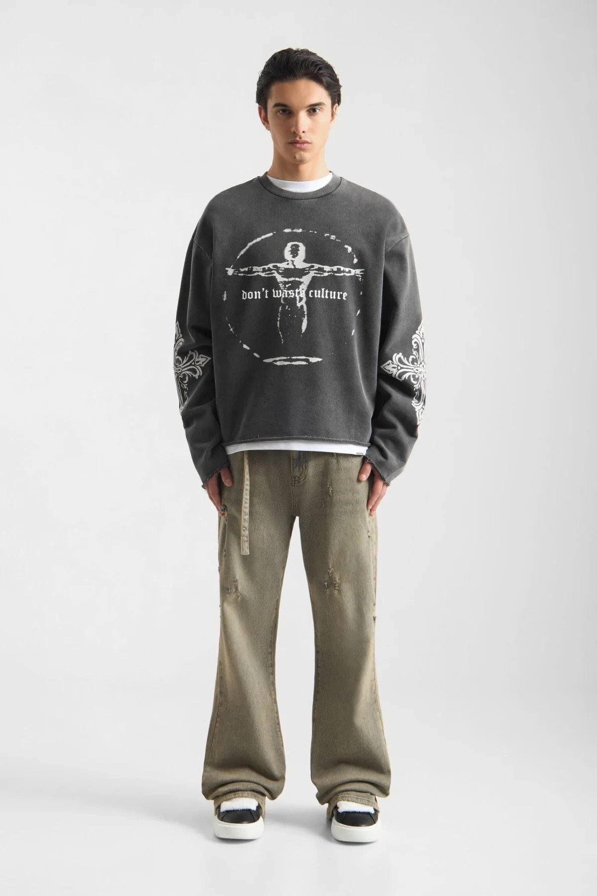 The Xavira sweater balances structure with controlled rawness. The washed cotton gives it a worn-in feel, while the artwork anchors the design visually. Expressive without being loud, built to stand on its own.