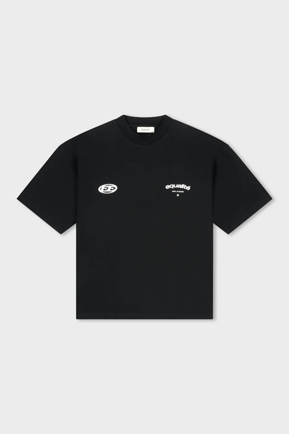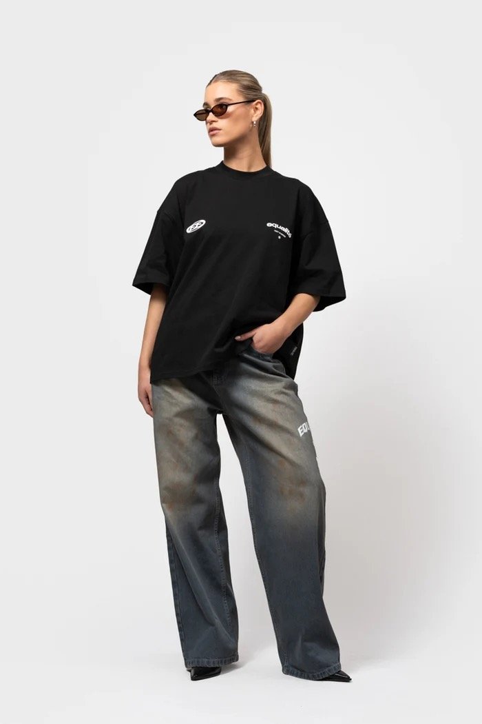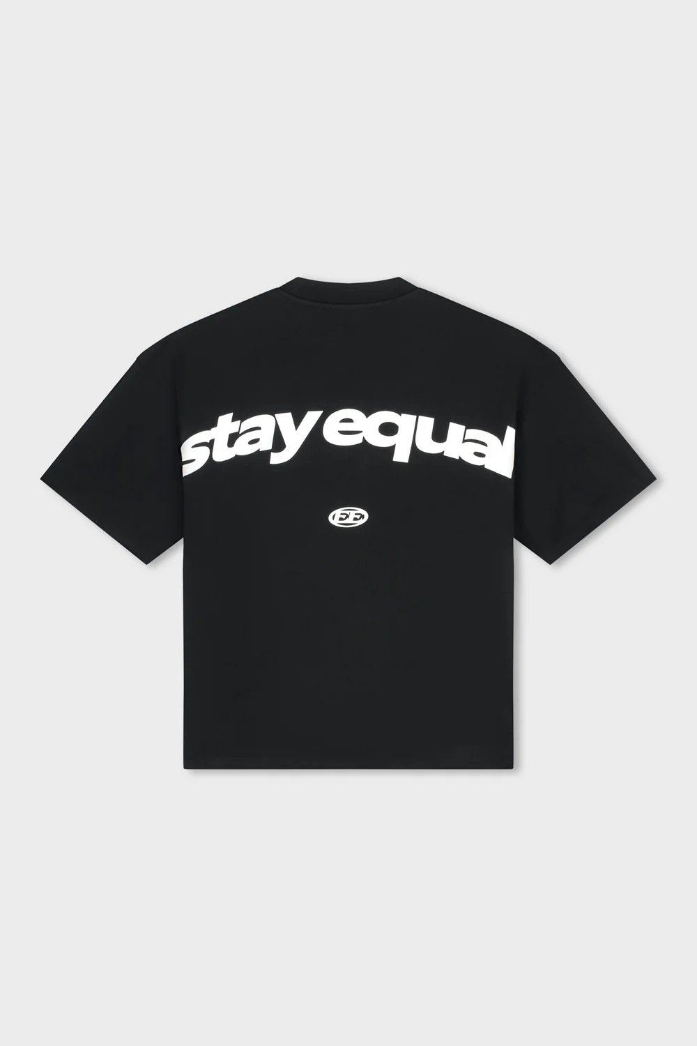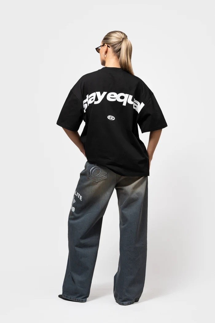 Introducing de Equalité Stay Equal Boxy Tee in Black. De tee heeft een boxy fit met een ronde kraag en is voorzien van een witte zeefdruk van het Stay Equal logo op de borst en op de rug.
