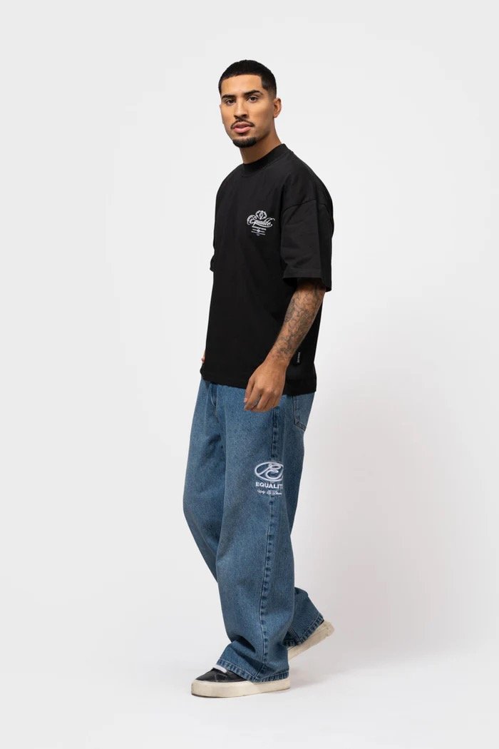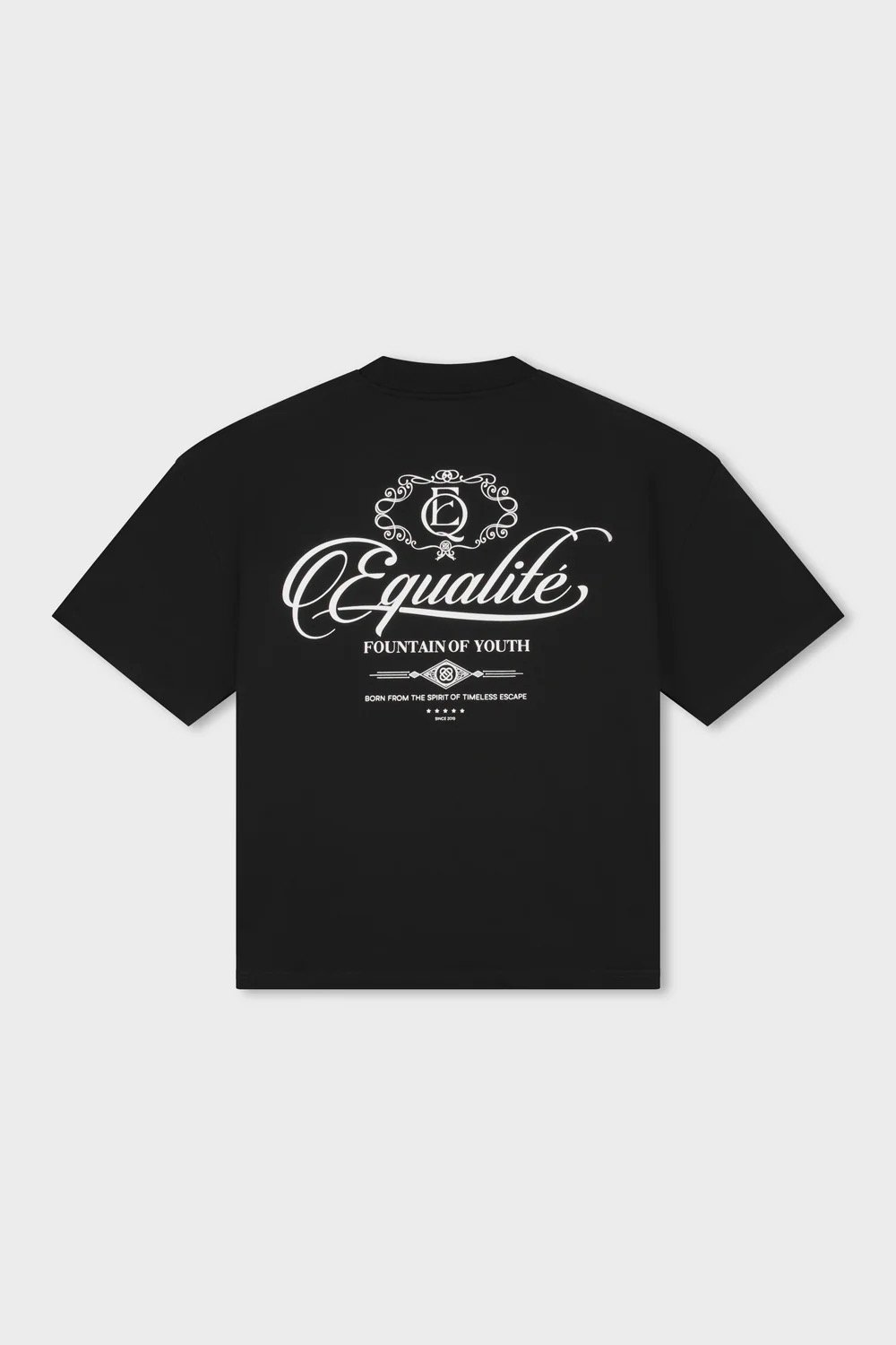 Introducing de Equalité Yuki Boxy Tee 2.0 in Black. De tee heeft een boxy fit met een ronde kraag en is voorzien van een witte Yuki zeefdruk op de borst en op de rug.
