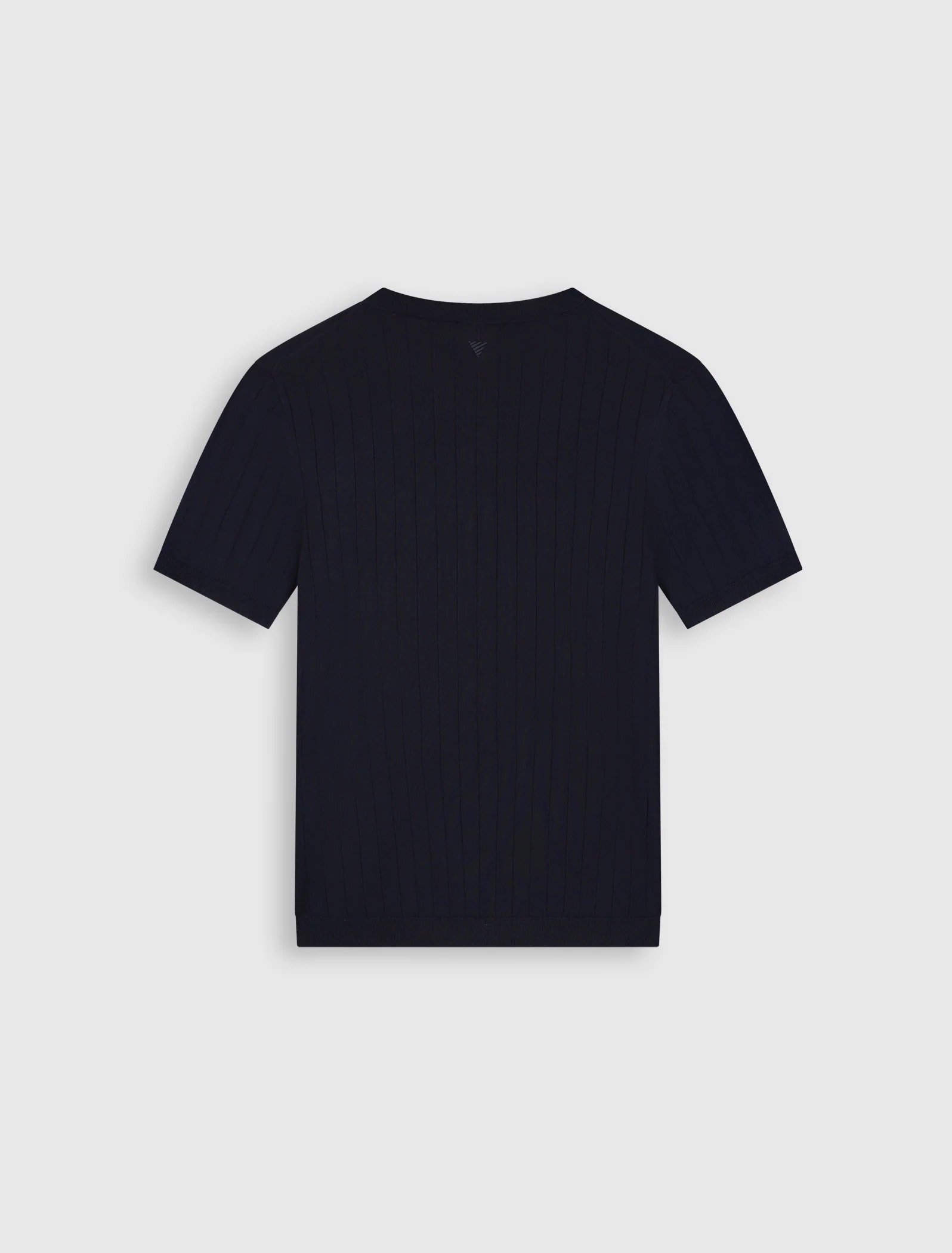 The Drop Needle Knit T-shirt comes in a regular fit with a classic crewneck, knitted from 80% viscose and 20% nylon for a smooth and composed handfeel. The drop needle technique adds subtle structure, finished with ribbed body and sleeve cuffs. A tonal signature triangle at the back neckline completes this clean and refined knit.
