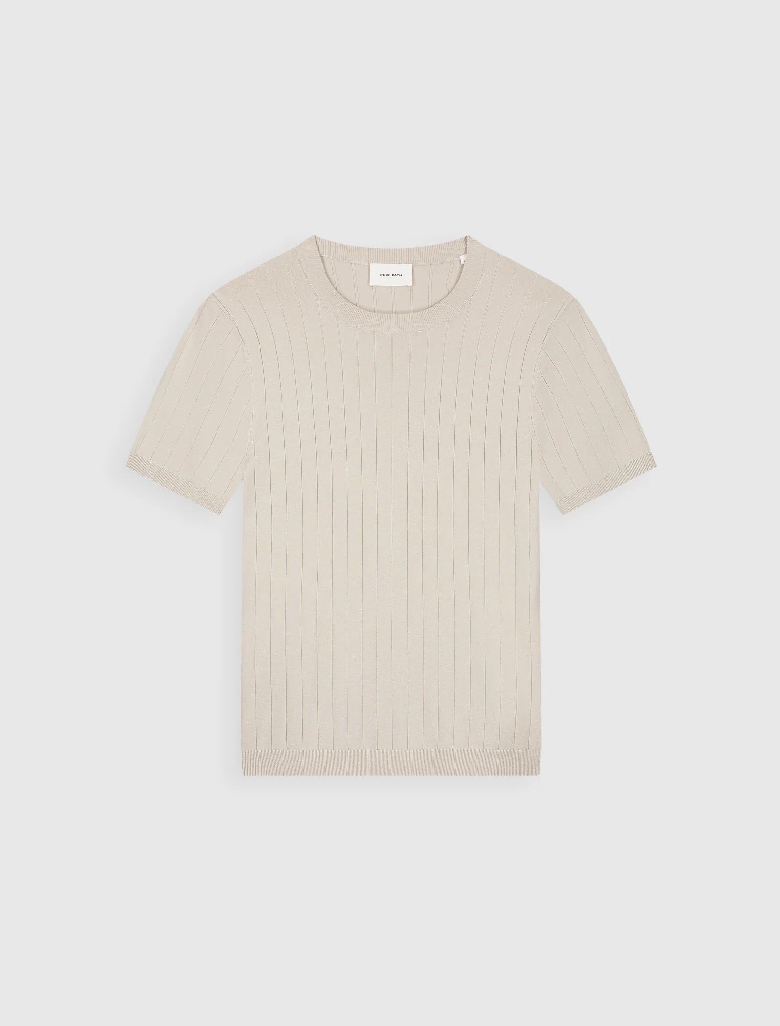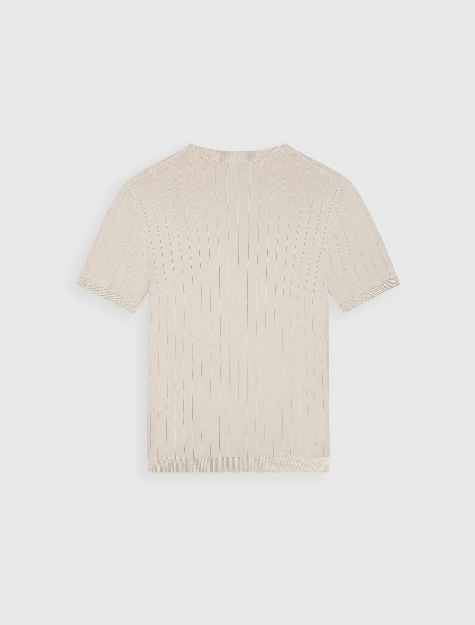 The Drop Needle Knit T-shirt comes in a regular fit with a classic crewneck, knitted from 80% viscose and 20% nylon for a smooth and composed handfeel. The drop needle technique adds subtle structure, finished with ribbed body and sleeve cuffs. A tonal signature triangle at the back neckline completes this clean and refined knit.
