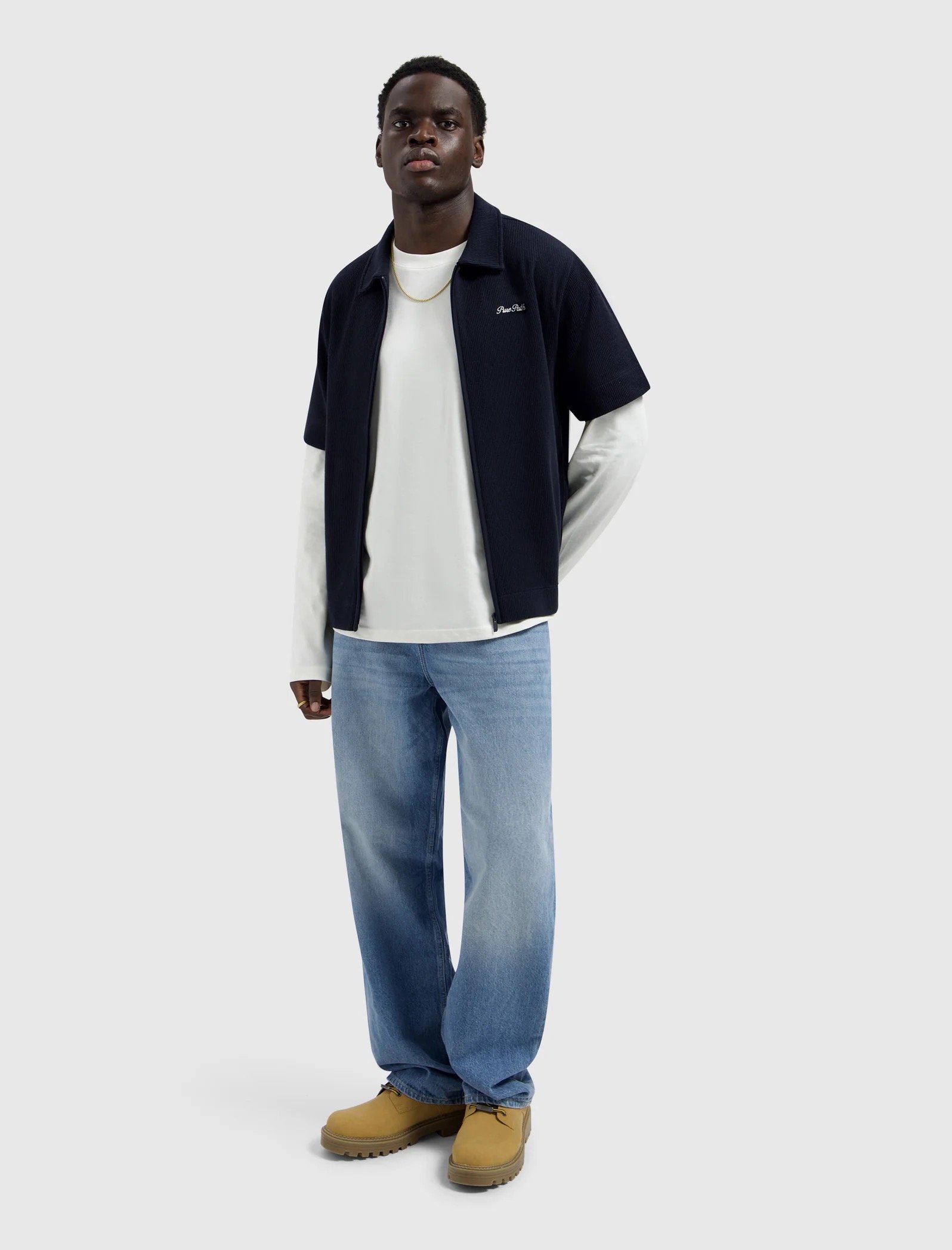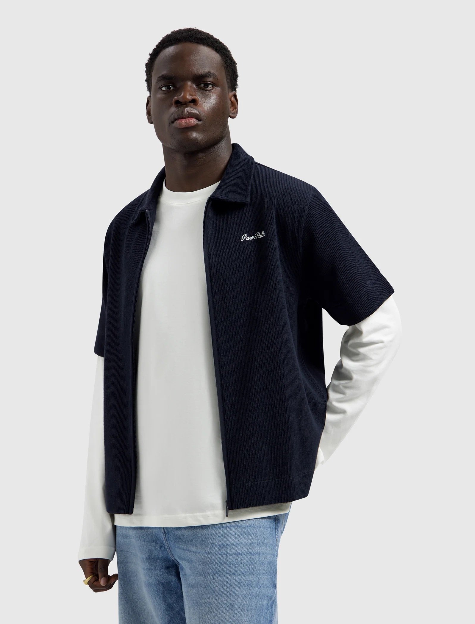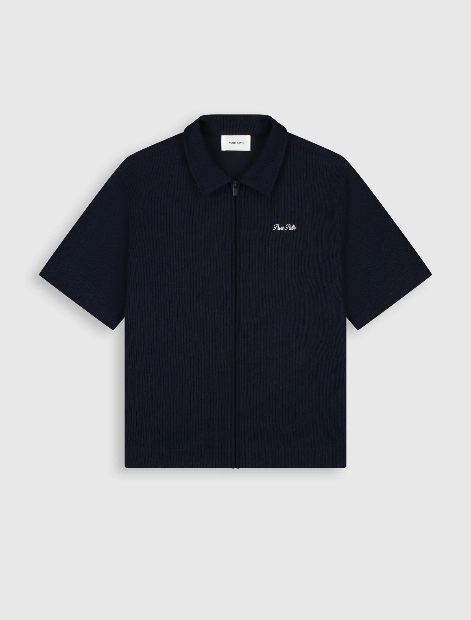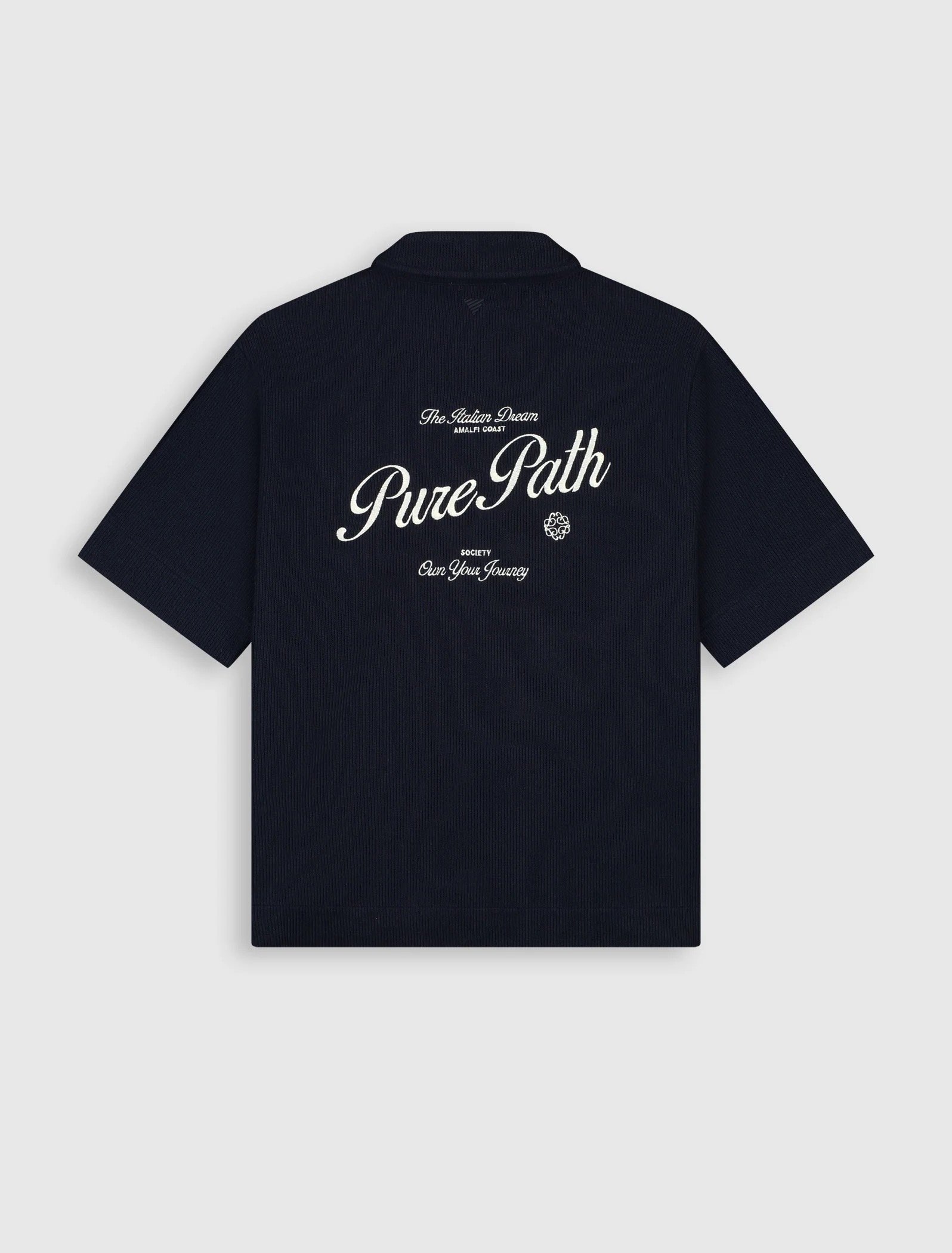 The Italian Dream Full zip Shortsleeve Shirt comes in a regular fit with a boxy length, crafted from 70% cotton and 30% polyester in a knitted heavy rib structure. The ribbed construction gives the fabric weight, stretch and a tactile surface that holds its shape while remaining breathable. A shirt collar with full zip closure sharpens the silhouette, while a written embroidery logo marks the chest. On the back, an embroidered composition unfolds as a layered expression of the Italian dream, where place, ambition and identity come together.