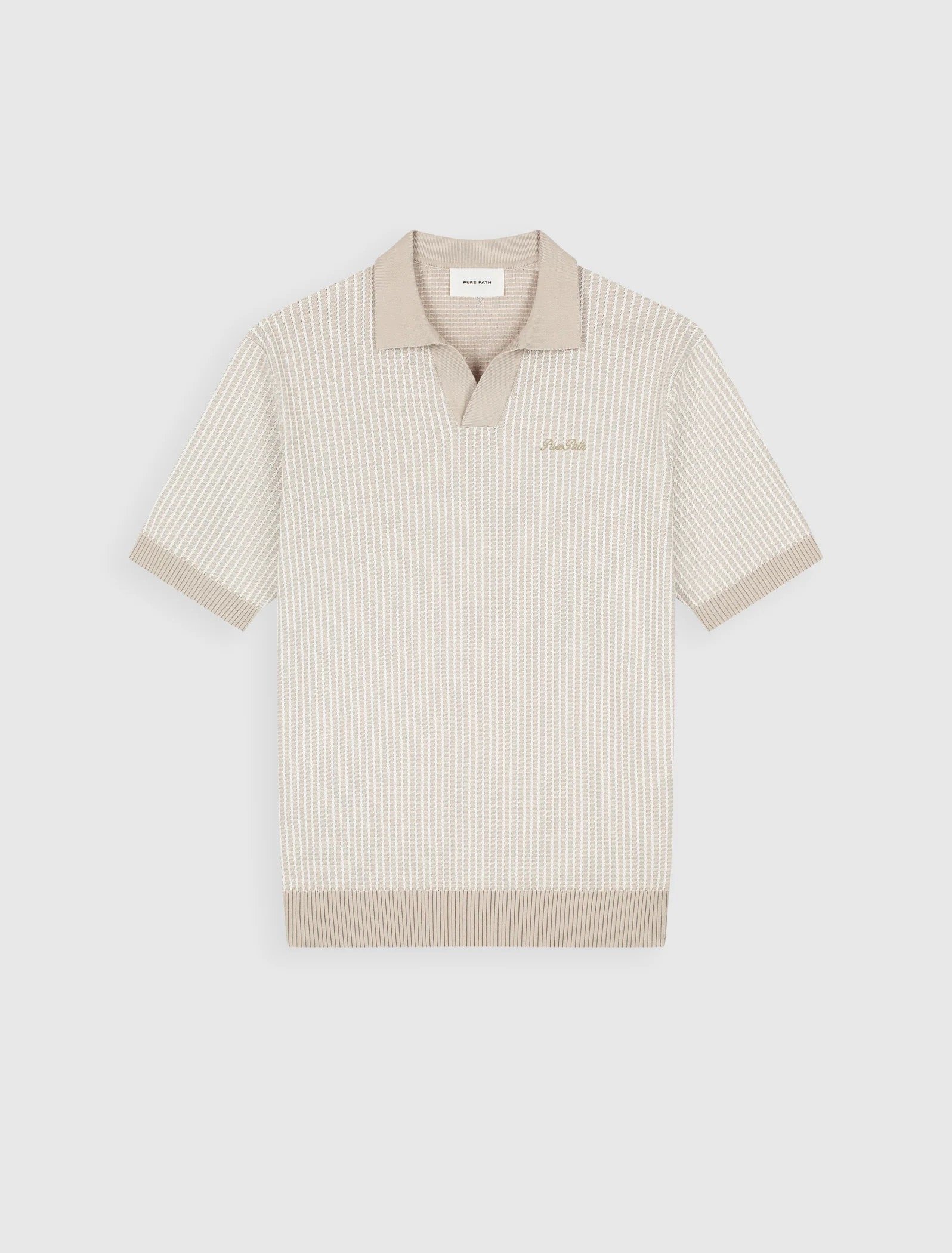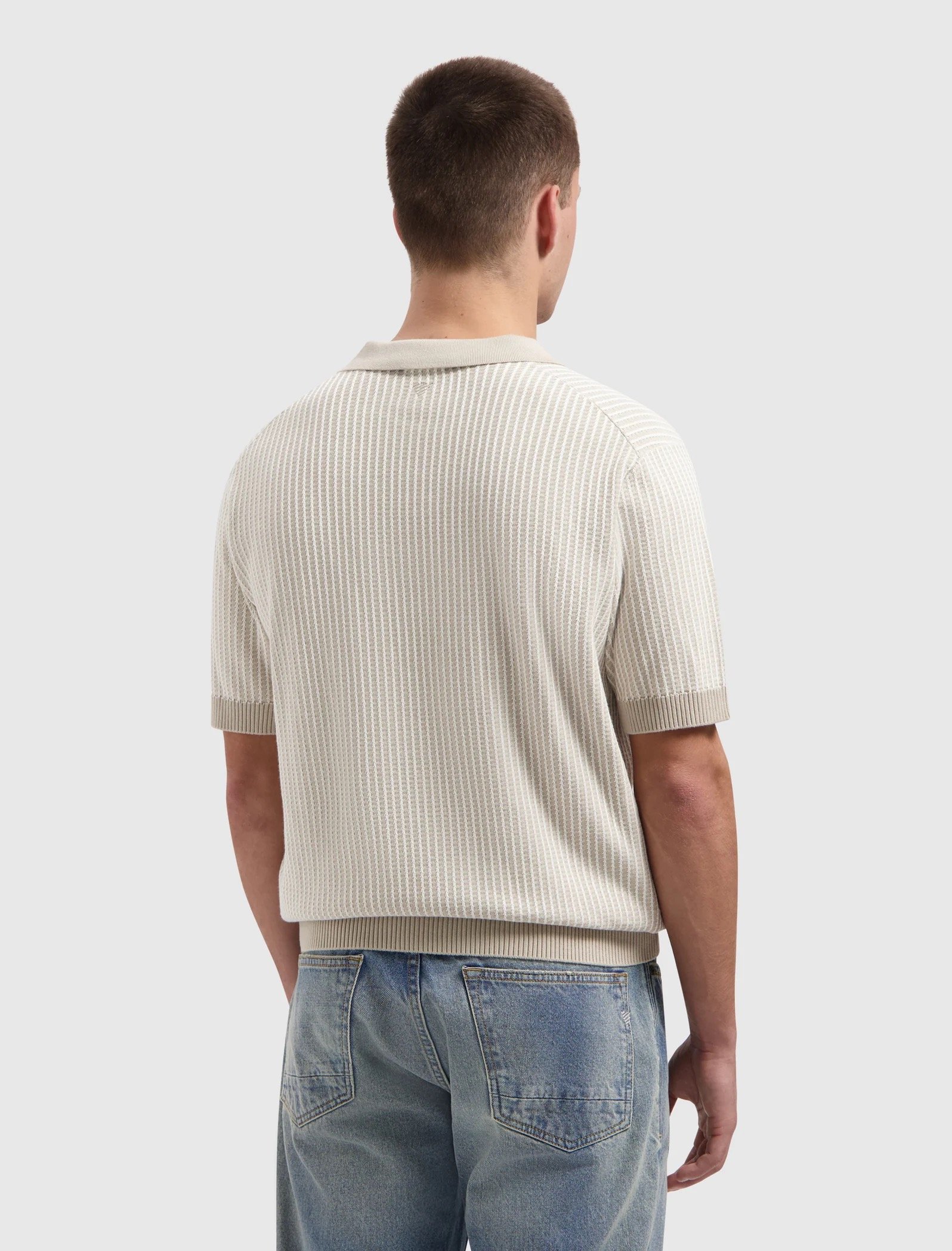 The Ladder Stitch Knit Polo comes in a regular fit with short sleeves and a clean polo neck, crafted from 100% cotton. The ladder stitch knit is built from two tones, creating subtle depth and texture while keeping the look refined. Finished with ribbed cuffs and body, an embroidered logo on the chest and a tonal signature triangle at the back neckline. A neat and clean knit, defined by quiet structure and effortless ease.
