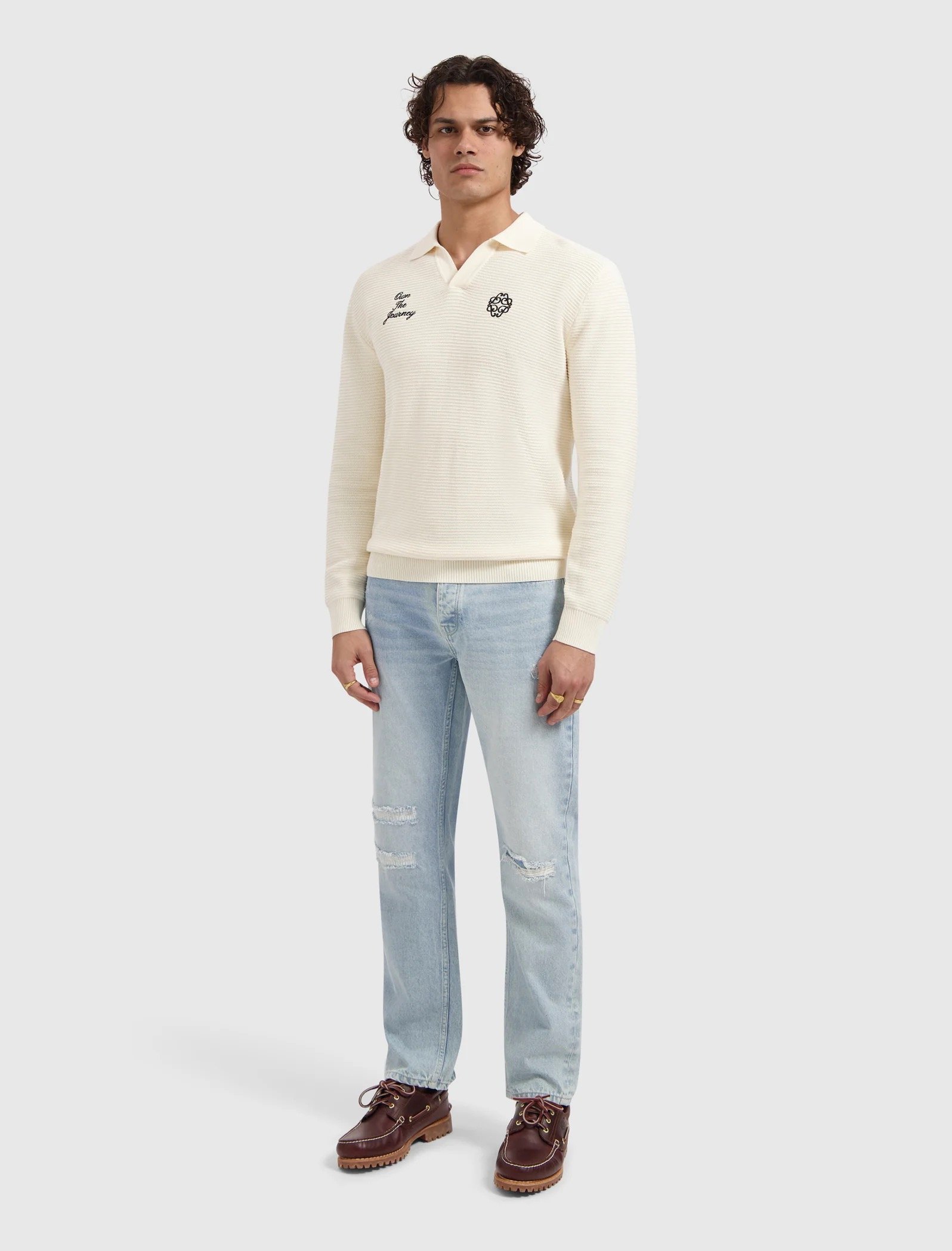 The Eric Regular Fit Jeans has a regular fit with a straight leg, crafted from 100% cotton denim for a firm and authentic feel. Finished in a light blue tone with a bleached and stone wash, shaped by whiskers and heavily damaged rip and repair details for a pronounced worn in character. Designed with a button fly, front and back pockets, triangle embroidery and a leather logo patch.