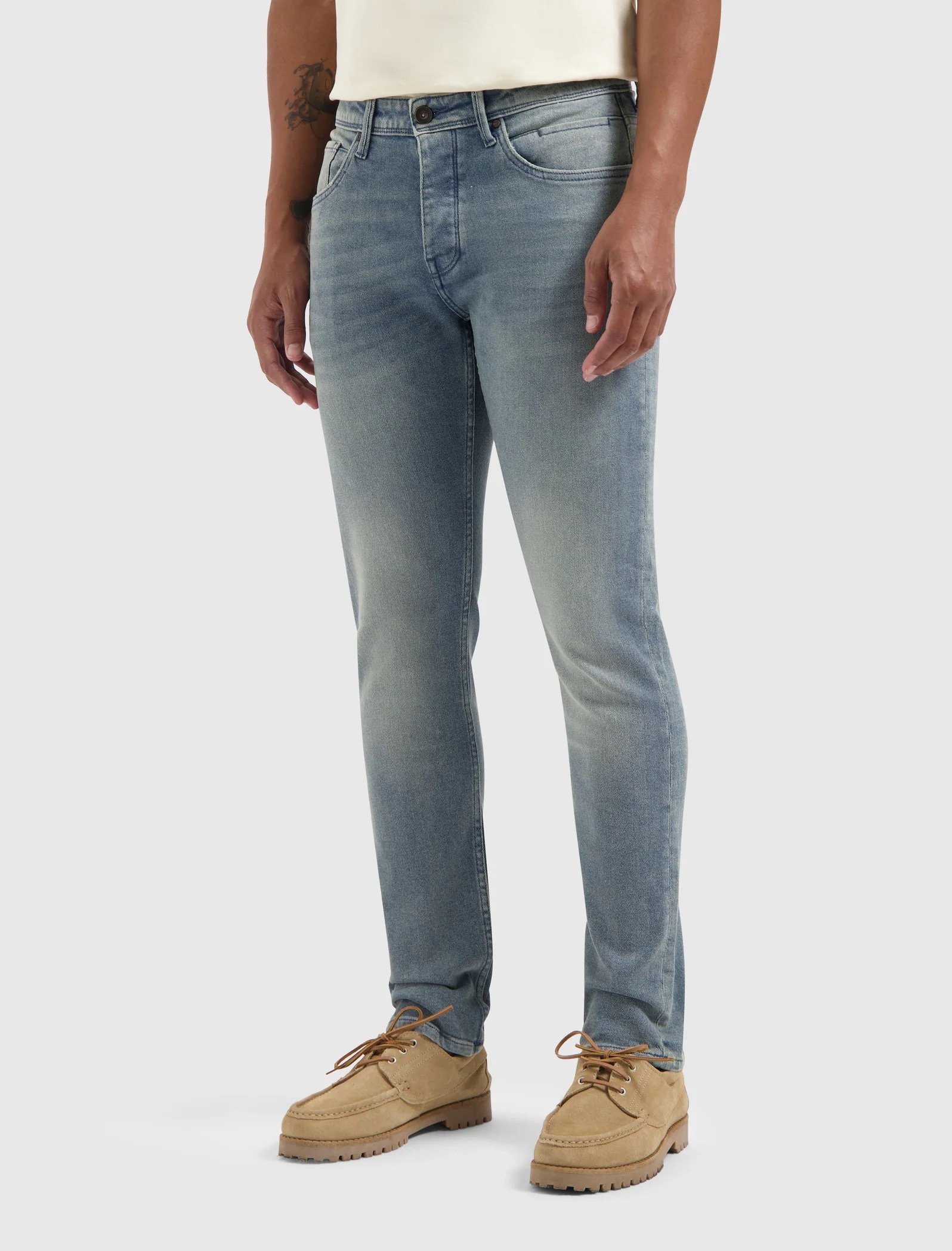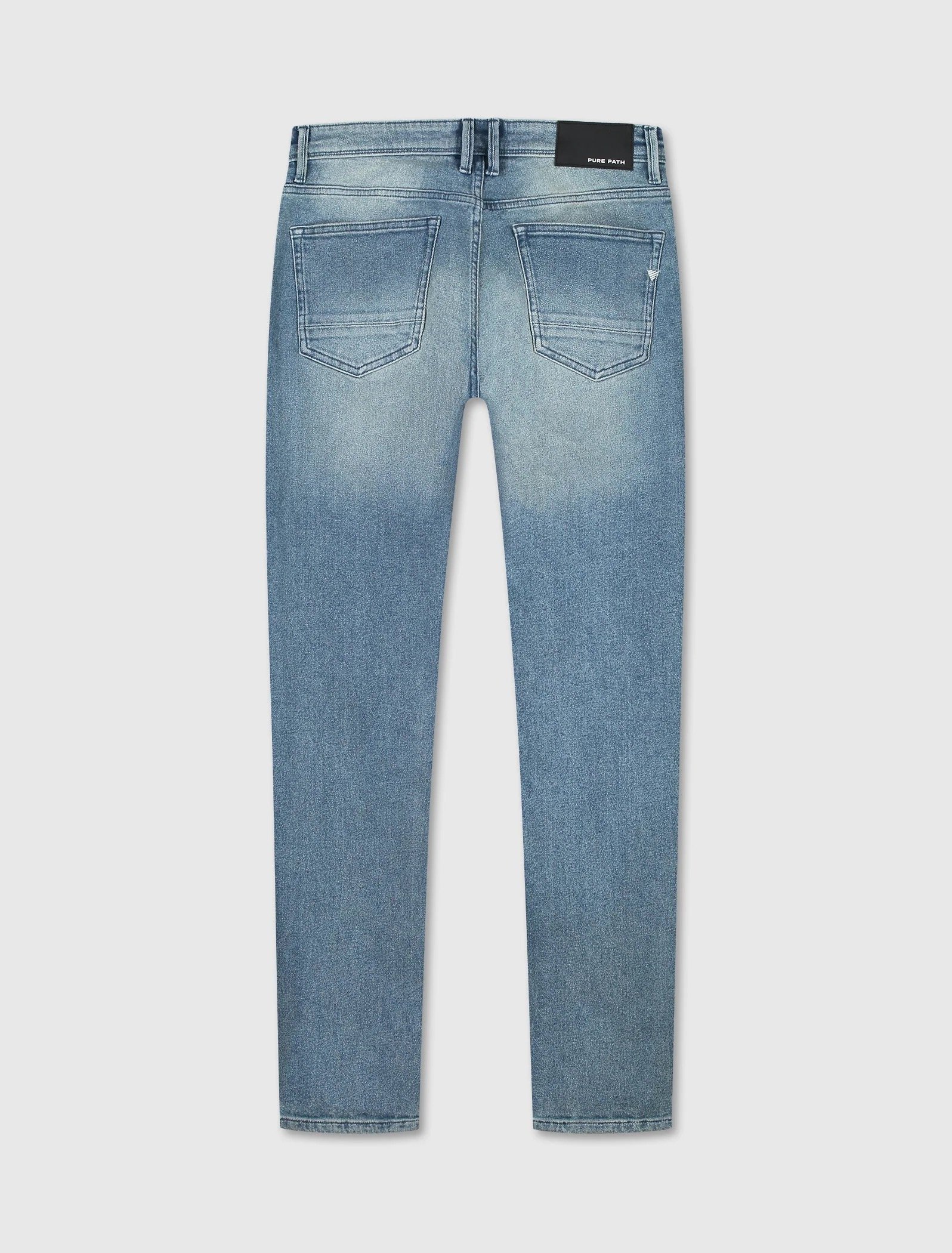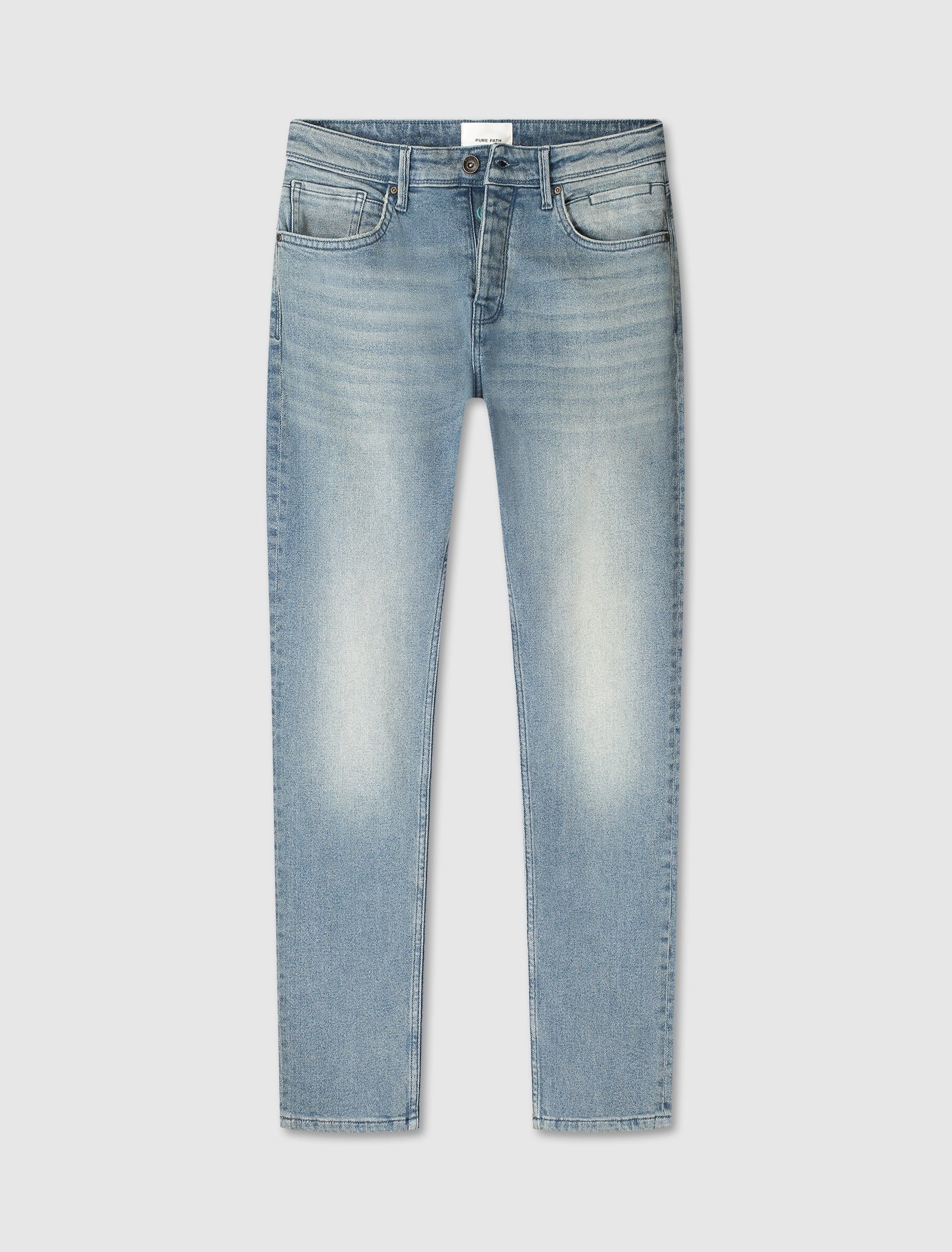The Ryan Slim Fit jeans in Denim Light Blue are cut with a tapered leg and made from 99% cotton and 1% elastane denim. Treated with enzyme and stone washes, plus a tinted finish for tonal depth. 3D whiskers add a touch of texture. Features include a button-fly, front and back pockets. Finished with our denim signature branding, including triangle embroidery and a leather logo patch.