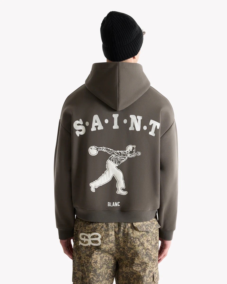Introducing the Gutter Hoodie: a bold graphic piece blending sport and street culture. Made from heavyweight fleece with a soft brushed inside for comfort. Featuring puff embroidery SAINT BLANC varsity lettering on the chest and a large vintage bowling artwork on the back. Finished with a relaxed fit, kangaroo pocket and ribbed trims.